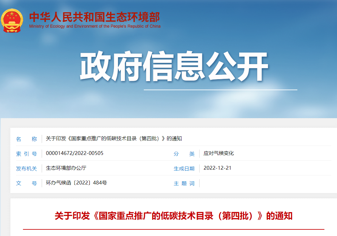 生態(tài)環(huán)境部印發(fā)《國家重點推廣的低碳技術(shù)目錄(第四批)》