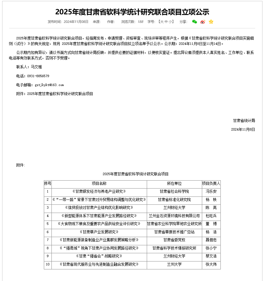 近日,甘肅省統(tǒng)計(jì)局公布了“2025年度甘肅省軟科學(xué)統(tǒng)計(jì)研究聯(lián)合項(xiàng)目”立項(xiàng)名單,由我單位副總工程師杜旺兵牽頭申報(bào)的《新型能源體系下甘肅能源產(chǎn)業(yè)發(fā)展路徑研究》課題成功獲批立項(xiàng)。