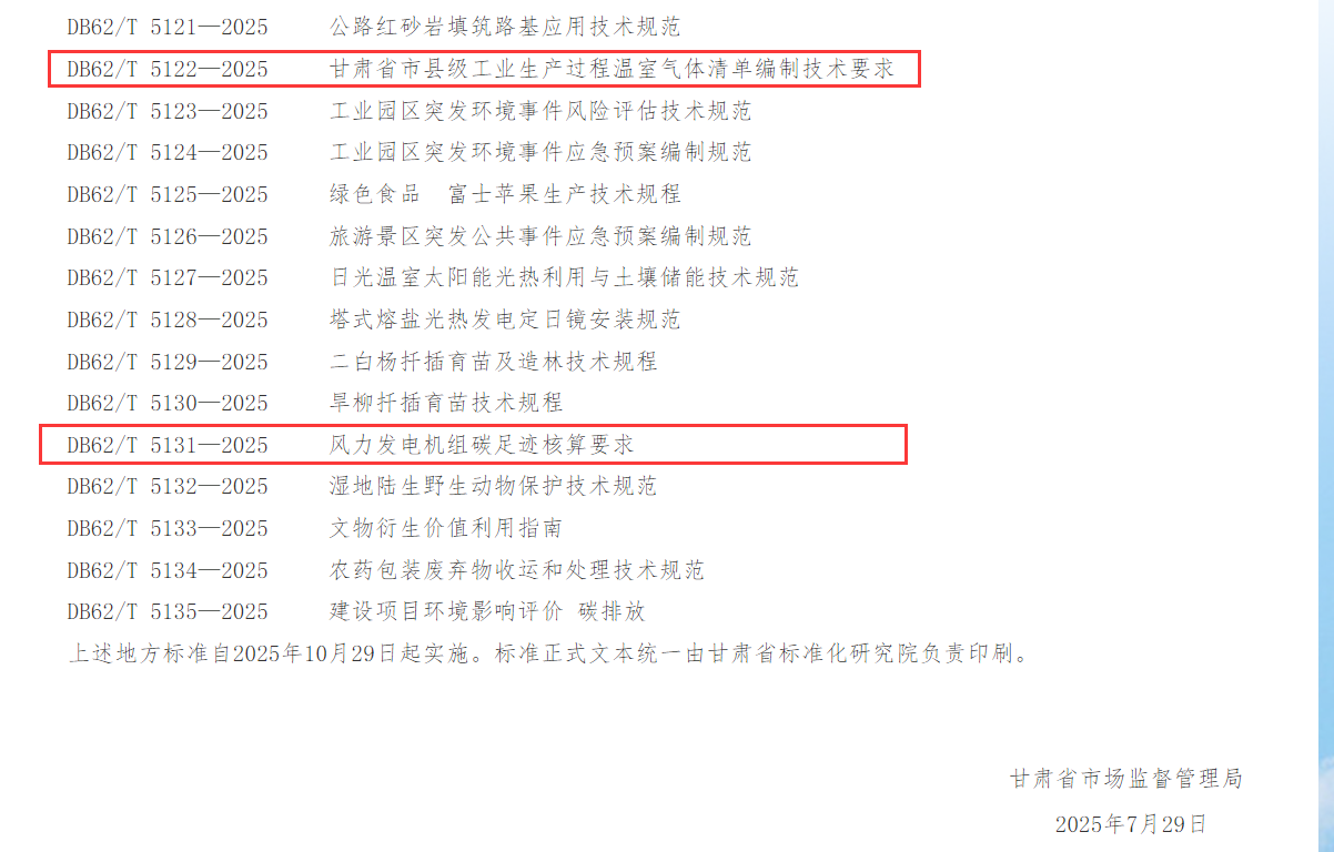 近日,甘肅省市場監(jiān)督管理局印發(fā)了《關于批準發(fā)布〈公路收費站云化設計規(guī)范〉等43 項地方標準的公告》(2025年第2號),我單位牽頭或參與起草的《甘肅省市縣級工業(yè)生產(chǎn)過程溫室氣體清單編制技術要求》(DB62/T 5122-2025)和《風力發(fā)電機組碳足跡核算要求》(DB62/T 5131-2025)2項地方標準獲批發(fā)布,并將于10月29日正式實施。